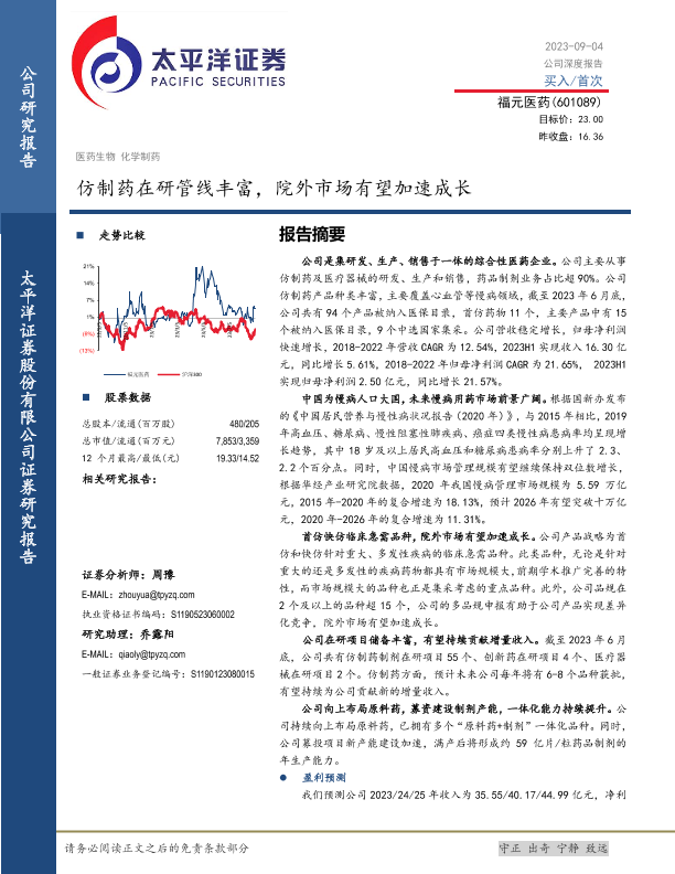 【太平洋证券】【20230904】深度报告-20230904-太平洋-福元医药-601089.SH-仿制药在研管线丰富_院外市场有望加速成长-30页