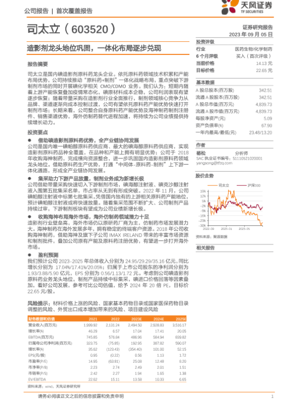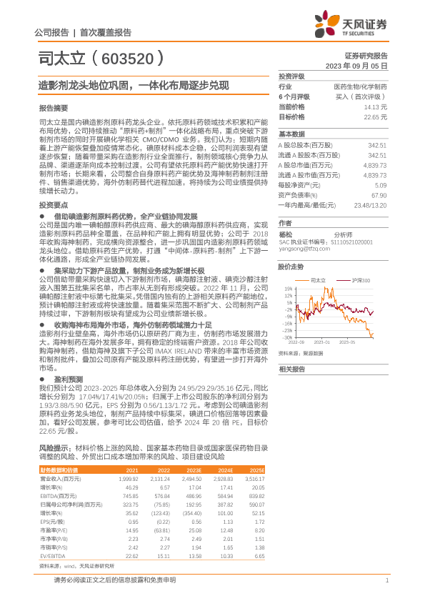【天风证券】【20230905】深度报告-20230905-天风证券-司太立-603520.SH-造影剂龙头地位巩固_一体化布局逐步兑现-24页