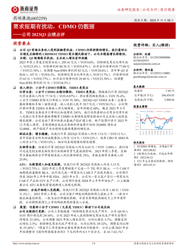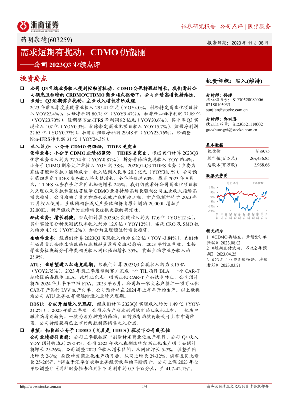 【浙商证券】【20231108】需求短期有扰动,CDMO仍靓丽——公司2023Q3业绩点评-4页