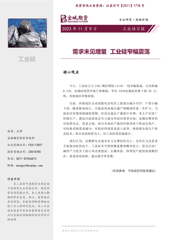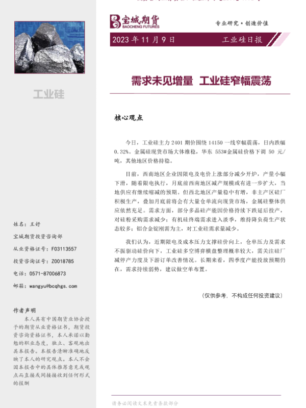 【宝城期货】【20231109】20231109-宝城期货-工业硅日报_需求未见增量_工业硅窄幅震荡-7页