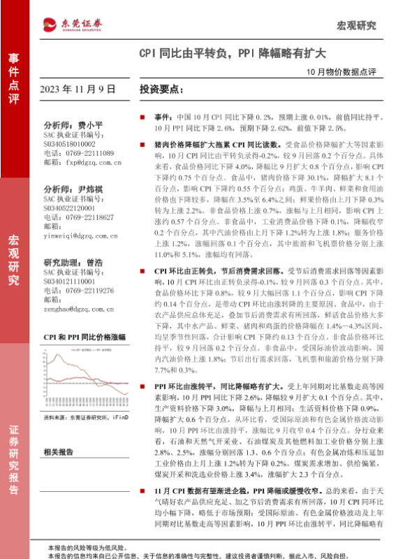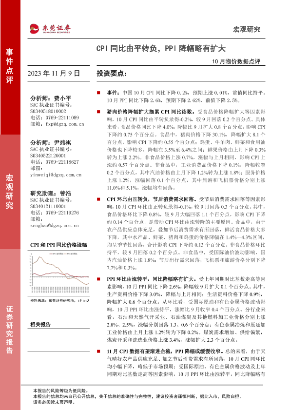 【东莞证券】【20231109】10月物价数据点评:CPI同比由平转负,PPI降幅略有扩大-3页
