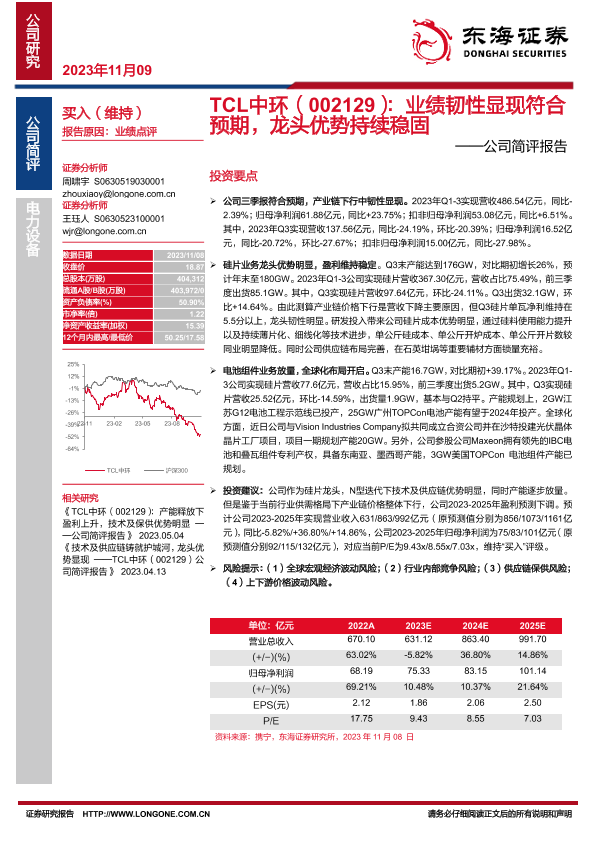 【东海证券】【20231109】TCL中环(002129):业绩韧性显现符合预期,龙头优势持续稳固——公司简评报告-3页