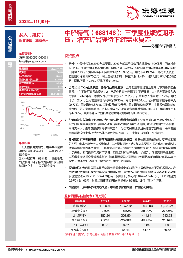 【东海证券】【20231109】中船特气(688146):三季度业绩短期承压,增产扩品静待下游需求复苏——公司简评报告-3页