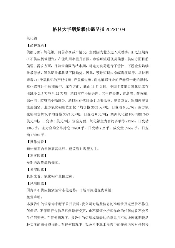 【格林大华期货】【20231109】格林大华期货氧化铝早报 20231109-2页