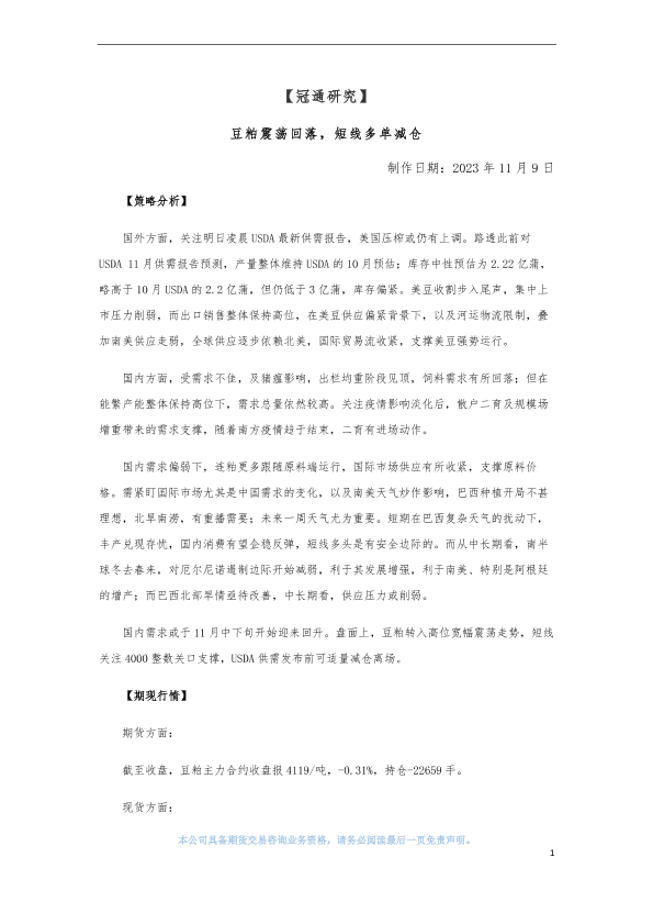 【冠通期货】【20231109】豆粕震荡回落,短线多单减仓-4页