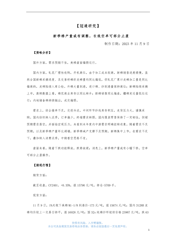 【冠通期货】【20231109】新季棉产量或有调整_长线空单可部分止盈-4页