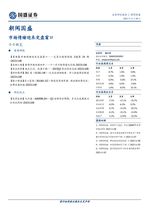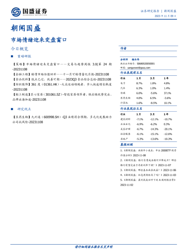 变盘窗口 市场情绪 投资建议 行业表现 证券研究