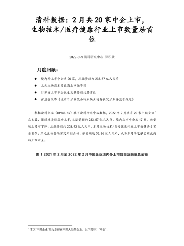 【清科研究中心】【20220309】清科数据:2月共20家中企上市,生物技术-医疗健康行业上市数量居首位-11页