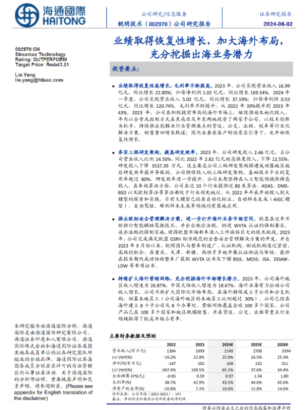 【海通国际】【20240602】锐明技术-002970.SZ-业绩取得恢复性增长,加大海外布局,充分挖掘出海业务潜力-12页