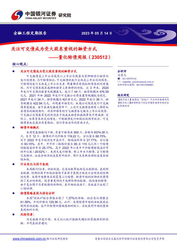 【银河证券】【20230514】量化转债周报:关注可交债成为受大股东重视的融资方式-20页