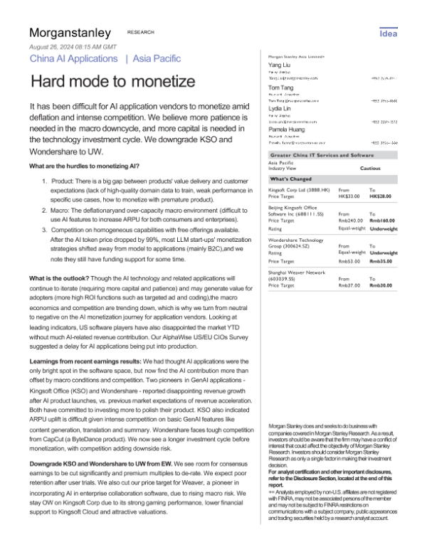 【Morgan Stanley】【20240826】大摩-中国ai应用市场-很难货币化,下调评级-32页