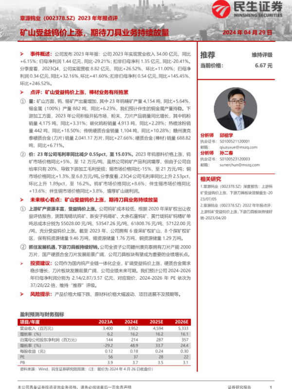 【民生证券】【20240429】章源钨业-002378.SZ-2023年年报点评:矿山受益钨价上涨,期待刀具业务持续放量-14页