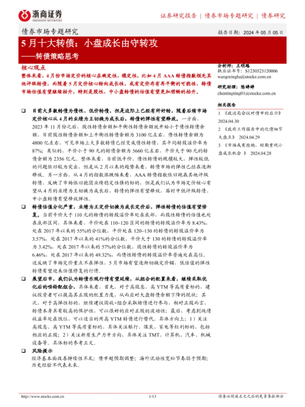 【浙商证券】【20240505】5月十大转债:小盘成长由守转攻-13页
