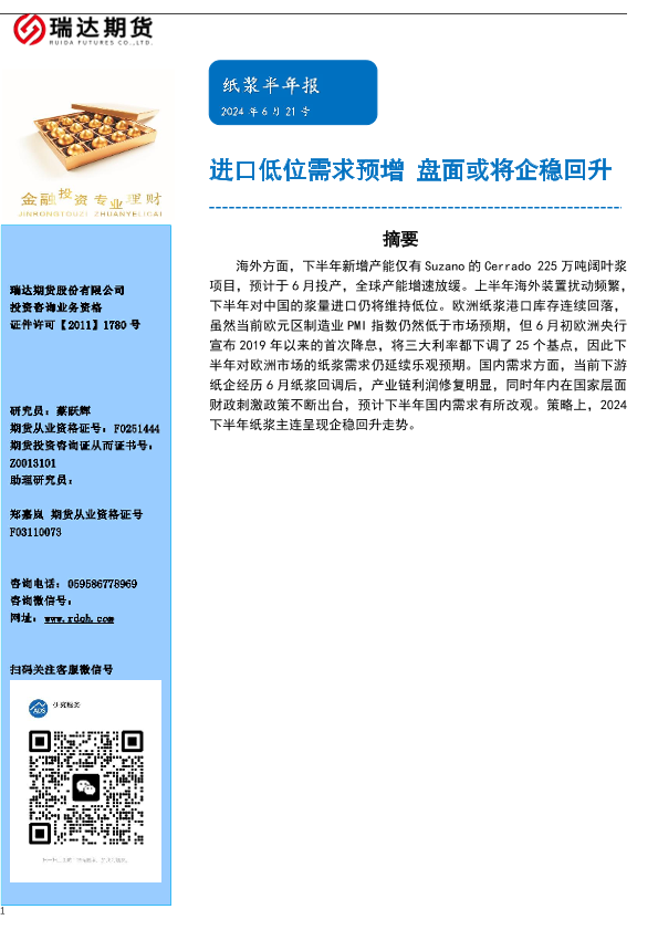 【瑞达期货】【20240621】纸浆半年报:进口低位需求预增,盘面或将企稳回升-11页