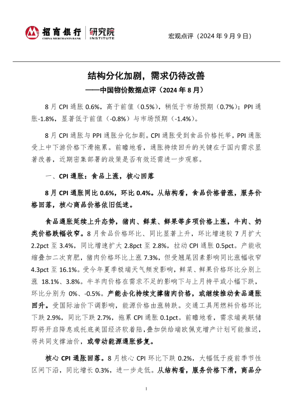 【招商银行】【20240909】中国物价数据点评(2024年8月)-结构分化加剧_需求仍待改善-3页