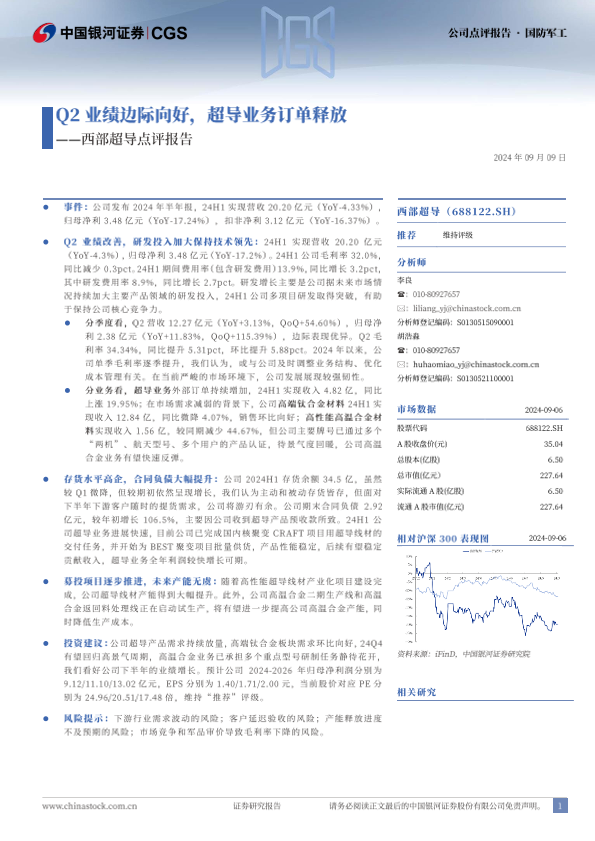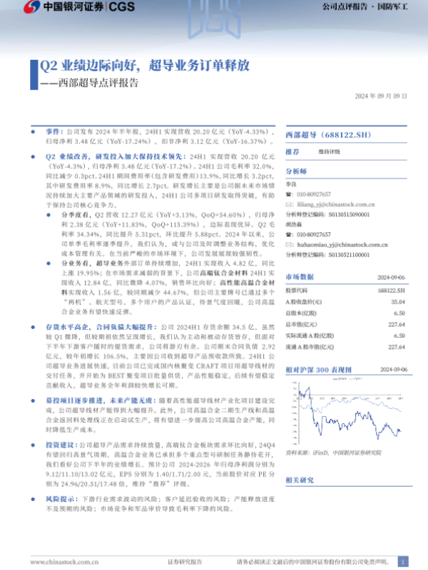 【银河证券】【20240909】Q2业绩边际向好,超导业务订单释放一西部超导点评报告-4页