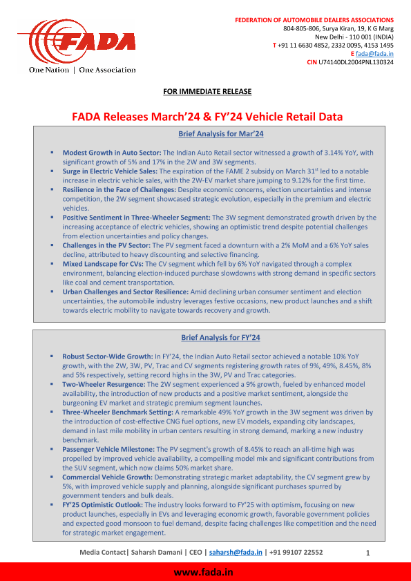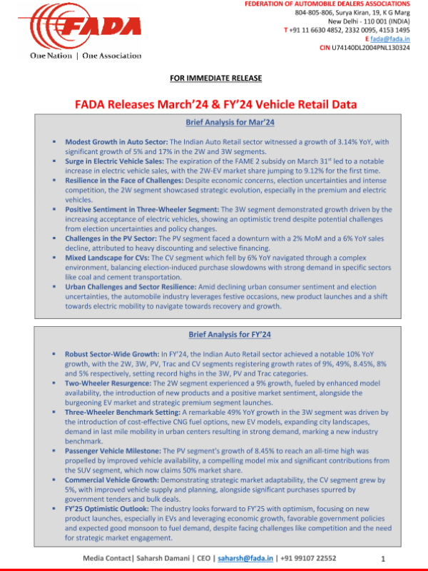 Federation of Automobile Dealers Associations (FADA) 交通运输仓储邮政 2024年 PDF 2.6 MB