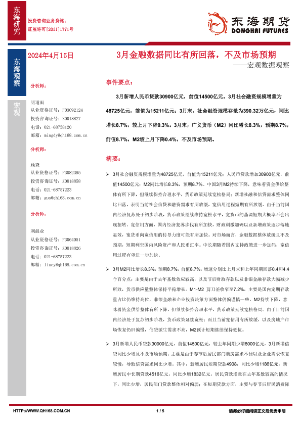 【东海期货】【20240415】3月金融数据同比有所回落,不及市场预期——宏观数据观察-5页
