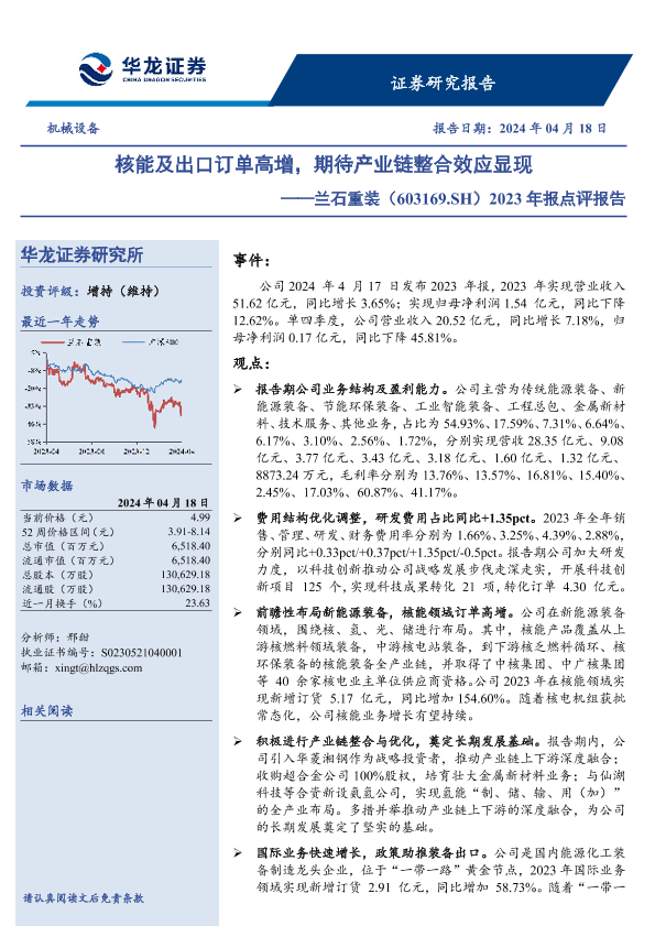 【华龙证券】【20240418】兰石重装(603169.SH)2023年报点评报告_核能及出口订单高增_期待产业链整合效应显现-4页