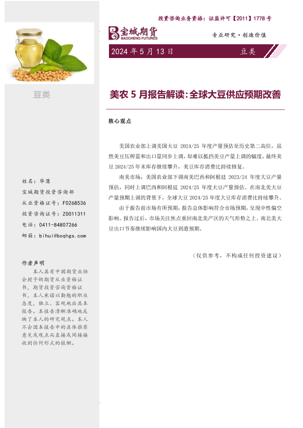 【宝城期货】【20240513】美农5月报告解读:全球大豆供应预期改善-8页