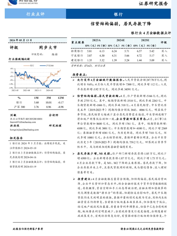 【财信证券】【20240513】银行业4月金融数据点评:信贷结构偏弱,居民存款下降-7页