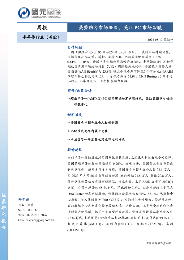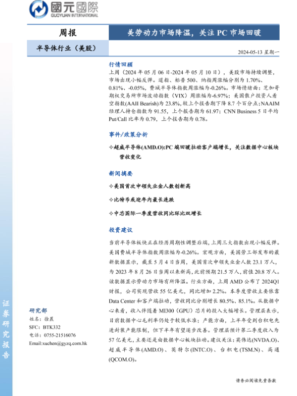 【国元国际】【20240513】美劳动力市场降温,关注PC市场回暖 - 半导体行业(美股)周报-8页