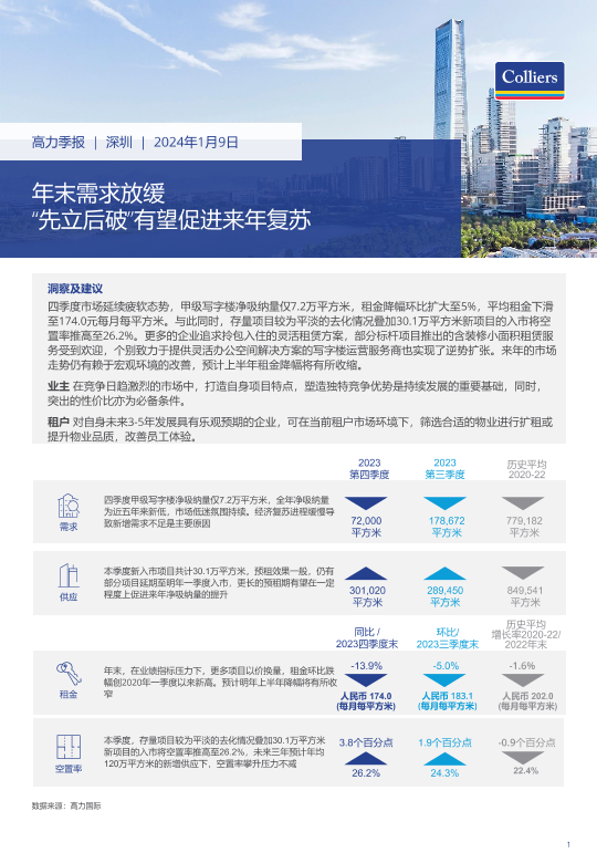 【高力国际】【202401】2023年第四季度深圳写字楼办公楼出租租金市场分析报告与发展前景趋势展望-4页