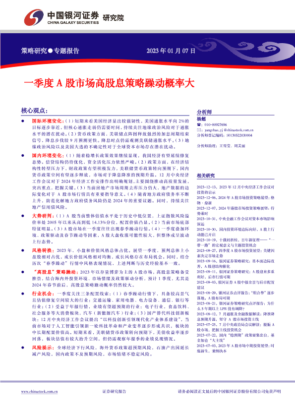 A股市场 宏观经济 股市预测 货币政策 高股息策略