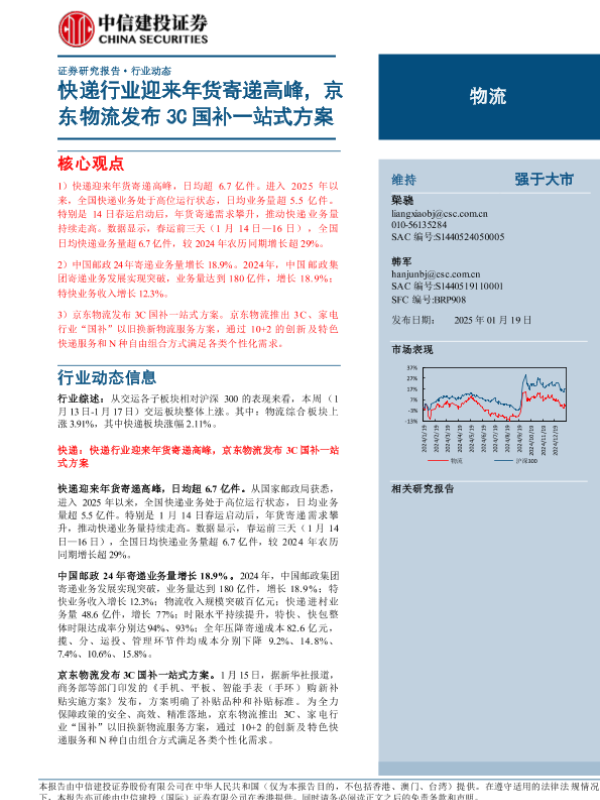 【中信建投证券】【20250119】物流行业动态:快递行业迎来年货寄递高峰,京东物流发布3C国补一站式方案-19页