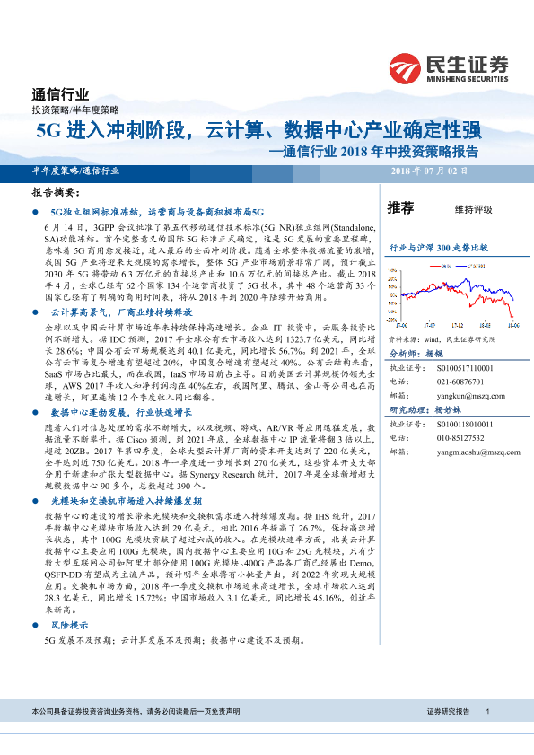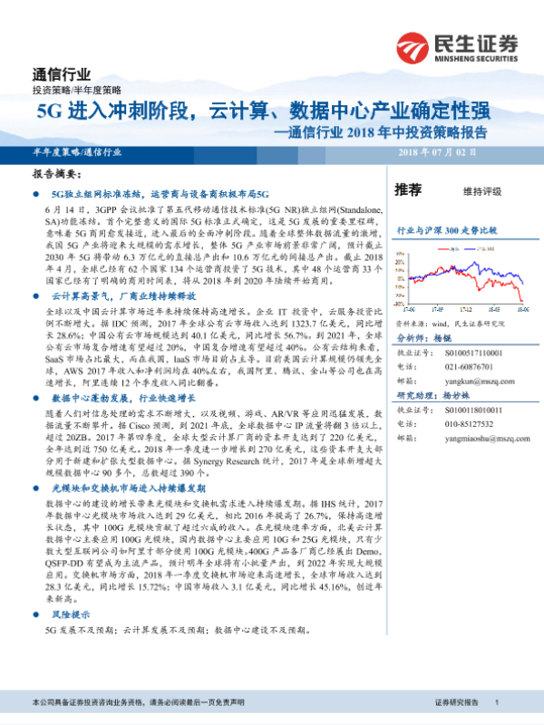 【民生证券】【20180702】通信行业2018年中投资策略报告:5G进入冲刺阶段,云计算、数据中心产业确定性强-36页