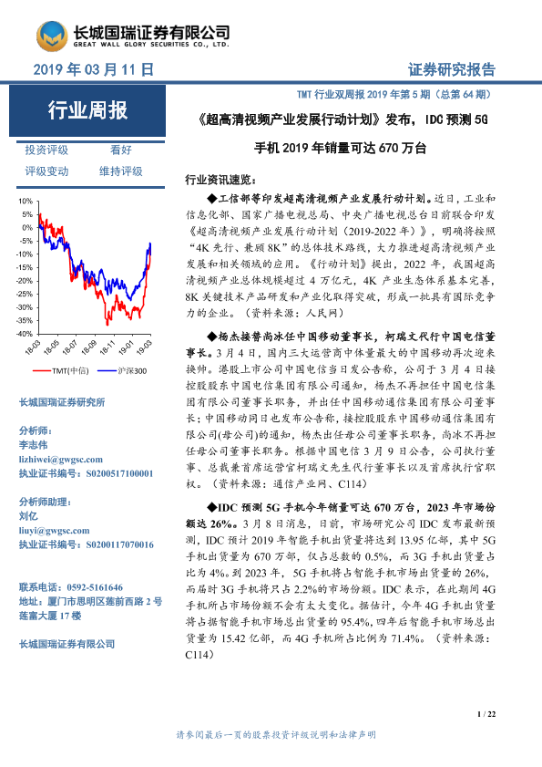 【长城国瑞证券】【20190311】日更新-长城国瑞证券-TMT行业双周报2019年第5期(总第64期):《超高清视频产业发展行动计划》发布,IDC预测5G手机2019年销量可达670万台-22页
