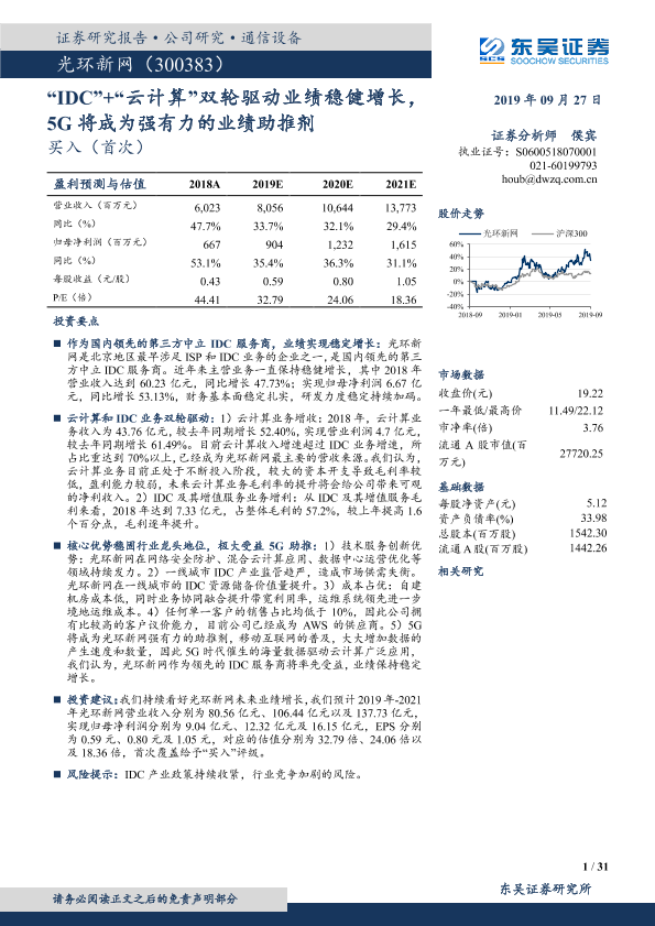【东吴证券】【20190927】光环新网-300383.SZ-“IDC”+“云计算”双轮驱动业绩稳健增长,5G将成为强有力的业绩助推剂-31页