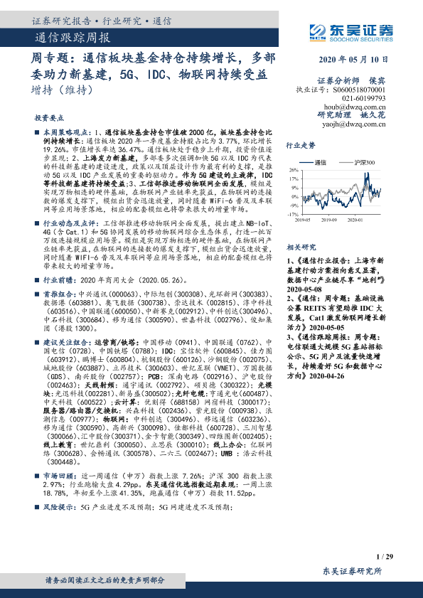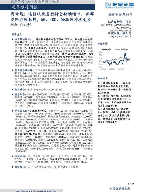 【东吴证券】【20200510】2020年05月10日更新-【东吴证券】通信跟踪周报:周专题:通信板块基金持仓持续增长,多部委助力新基建,5G、IDC、物联网持续受益-29页