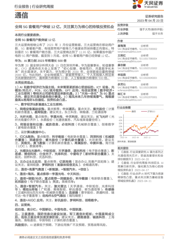 【天风证券】【20230423】2023年09月12日更新-通信-行业研究周报:全网5G套餐用户突破12亿,关注算力为核心的持续投资机会-13页