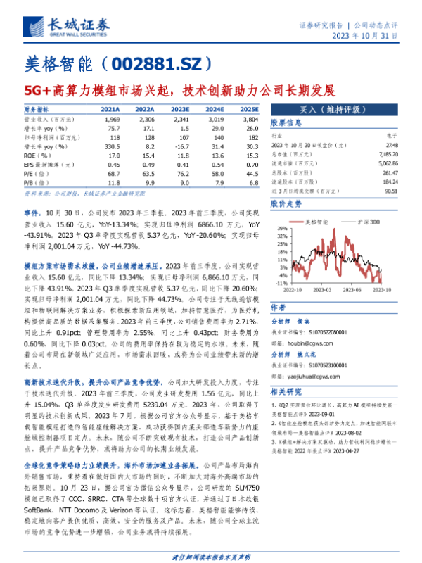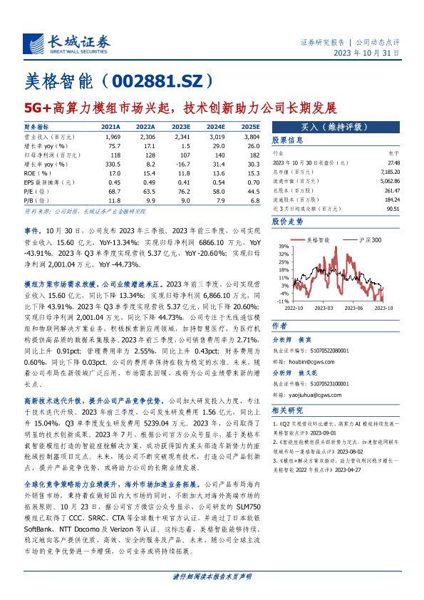 【长城证券】【20231031】2023年10月19日更新-美格智能(002881)5G+高算力模组市场兴起,技术创新助力公司长期发展-4页