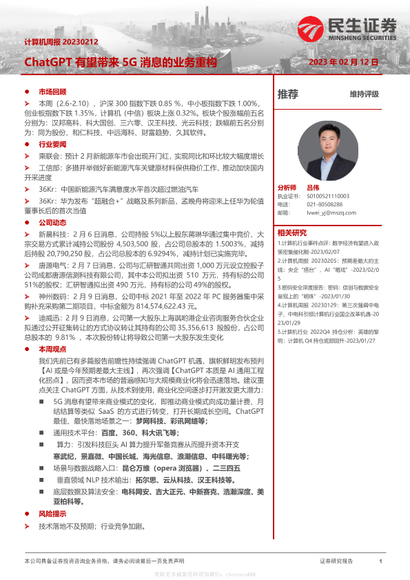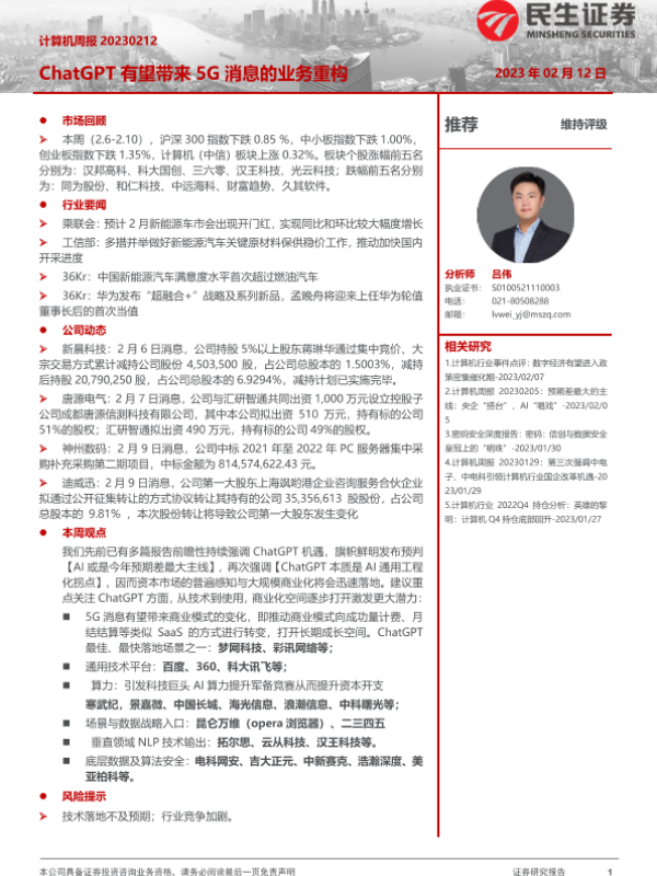 【民生证券】【20240101】计算机周报:ChatGPT有望带来5G消息的业务重构-20页