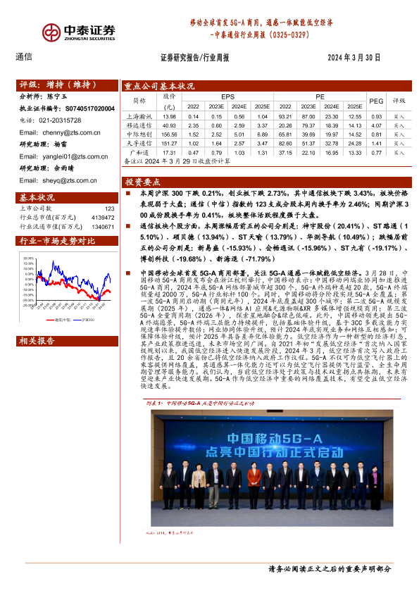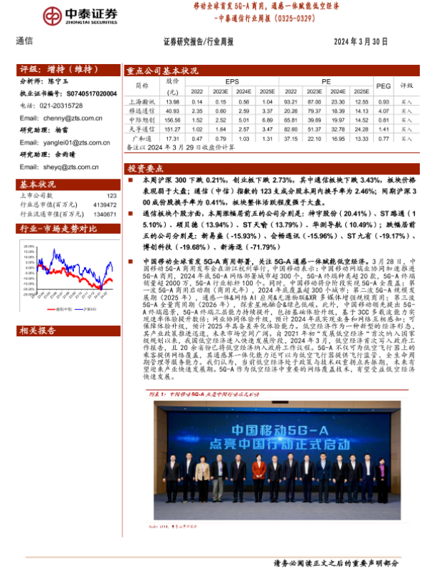 【中泰证券】【20240330】移动全球首发5G_A商用,通感一体赋能低空经济 - 中泰通信行业周报-21页