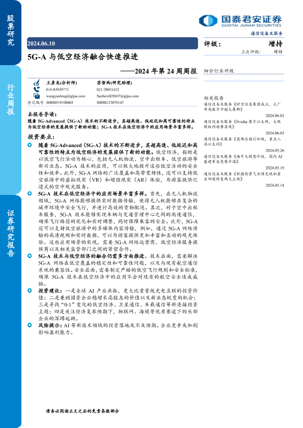 【国泰君安证券】【20240701】5G-A与低空经济融合快速推进——2024年第24周周报-7页