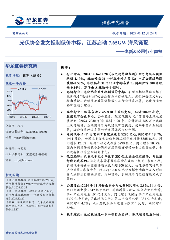 【华龙证券】【20241224】电新&公用行业周报:光伏协会发文抵制低价中标,江苏启动7.65GW海风竞配-16页