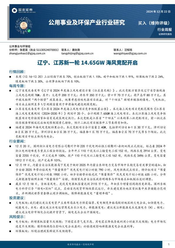 【国金证券】【20250217】公用事业及环保产业行业研究:辽宁、江苏新一轮14.65GW海风竞配开启-15页