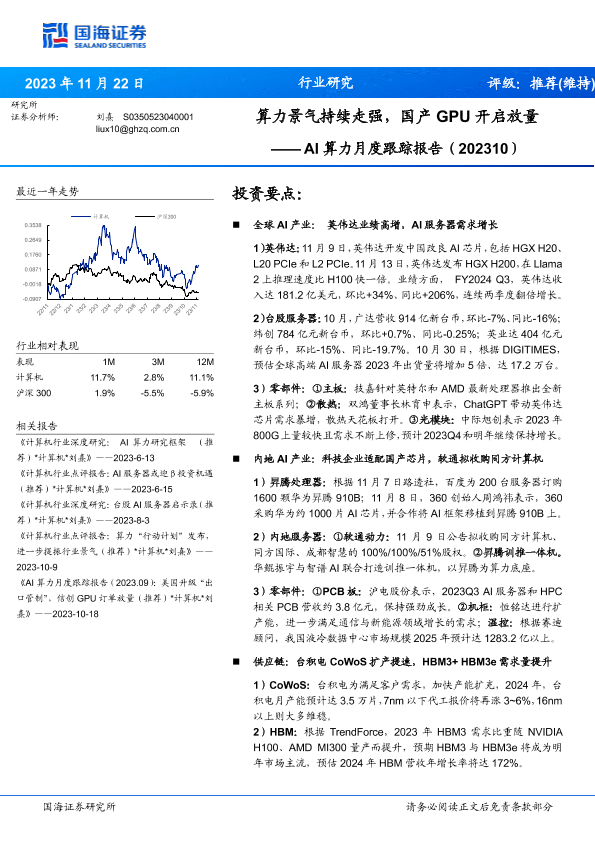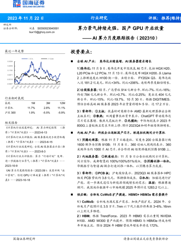 【国海证券】【20231122】2023年07月10日更新-计算机行业AI算力月度跟踪报告(202310):算力景气持续走强,国产GPU开启放量-22页
