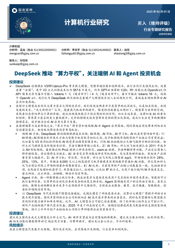 【国金证券】【20250210】计算机行业研究:DeepSeek推动“算力平权”,关注端侧AI和Agent投资机会-20页