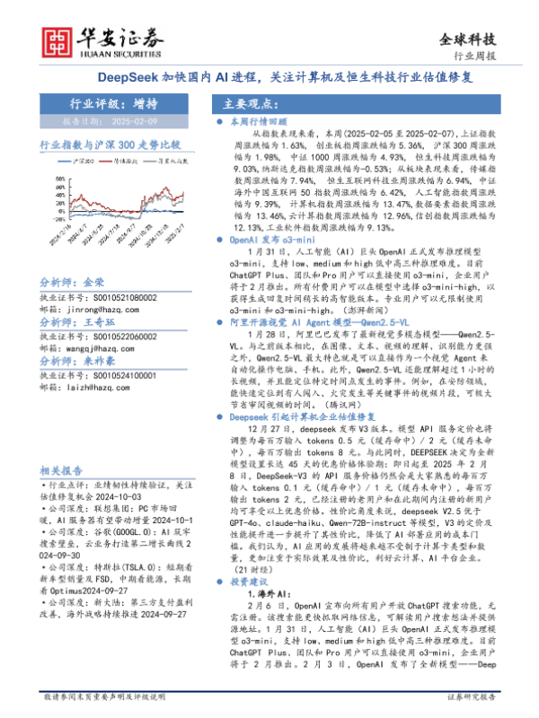 【华安证券】【20250209】全球科技行业周报:DeepSeek加快国内AI进程,关注计算机及恒生科技行业估值修复-27页