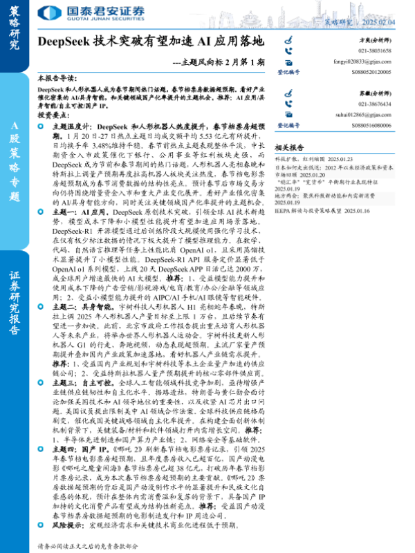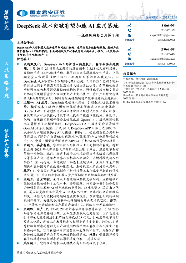 【国泰君安证券】【20250204】2025年02月18日更新-【国泰君安】主题风向标2月第1期:DeepSeek技术突破有望加速AI应用落地-15页