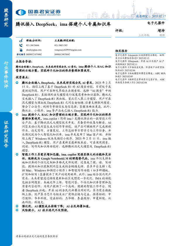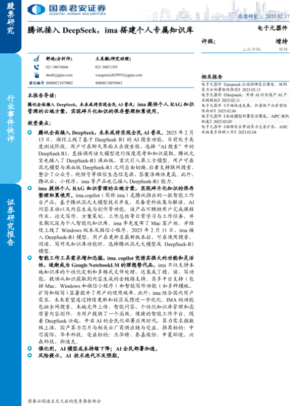 【国泰君安证券】【20250226】电子元器件行业:腾讯接入DeepSeek,ima搭建个人专属知识库-10页