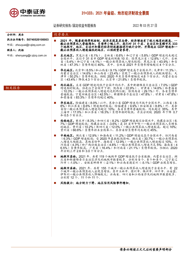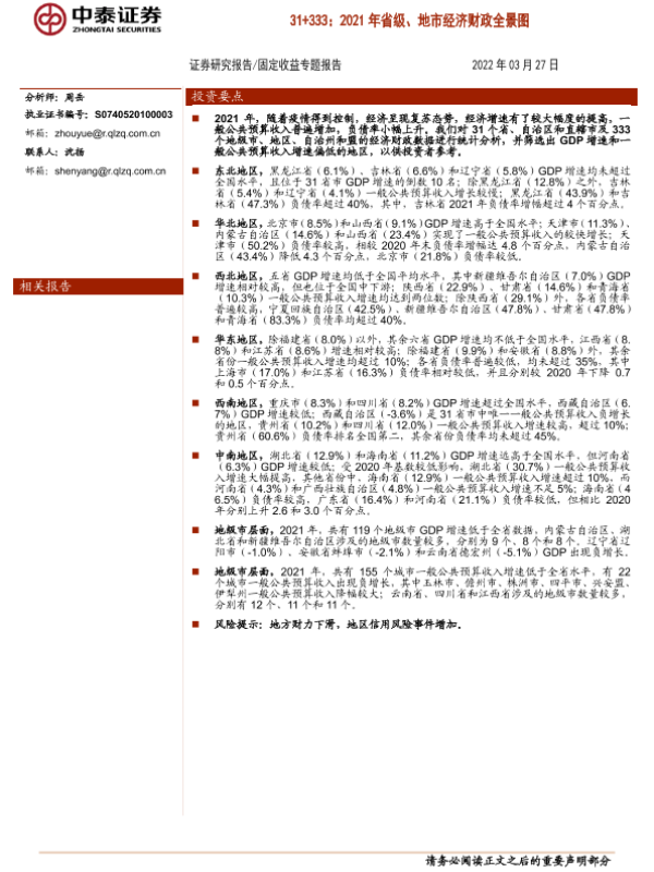 【中泰证券】【20220327】31+333:2021年省级、地市经济财政全景图-53页