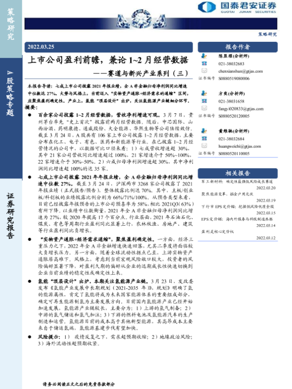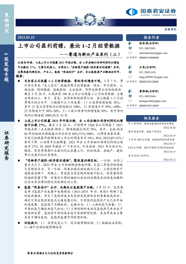 【国泰君安证券】【20220325】A股策略专题:赛道与新兴产业系列(三),上市公司盈利前瞻,兼论1_2月经营数据-15页