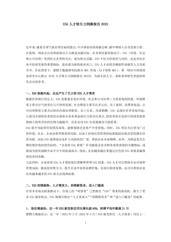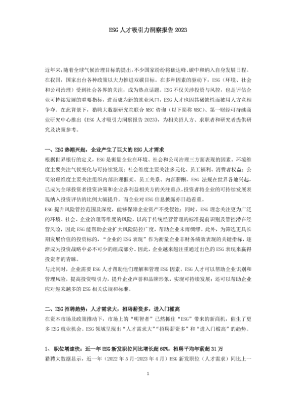 【猎聘大数据研究院联合MSC咨询、第一财经可持续商业研究中心】【20230710】ESG人才吸引力洞察报告 2023-11页
