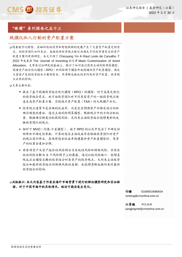 【海通证券】【20220330】规模化私人订制的资产配置方案-20页