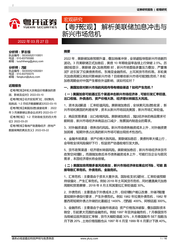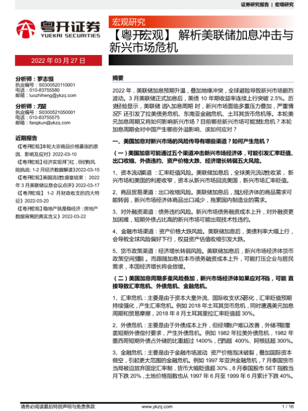 【粤开证券】【20220327】解析美联储加息冲击与新兴市场危机-16页